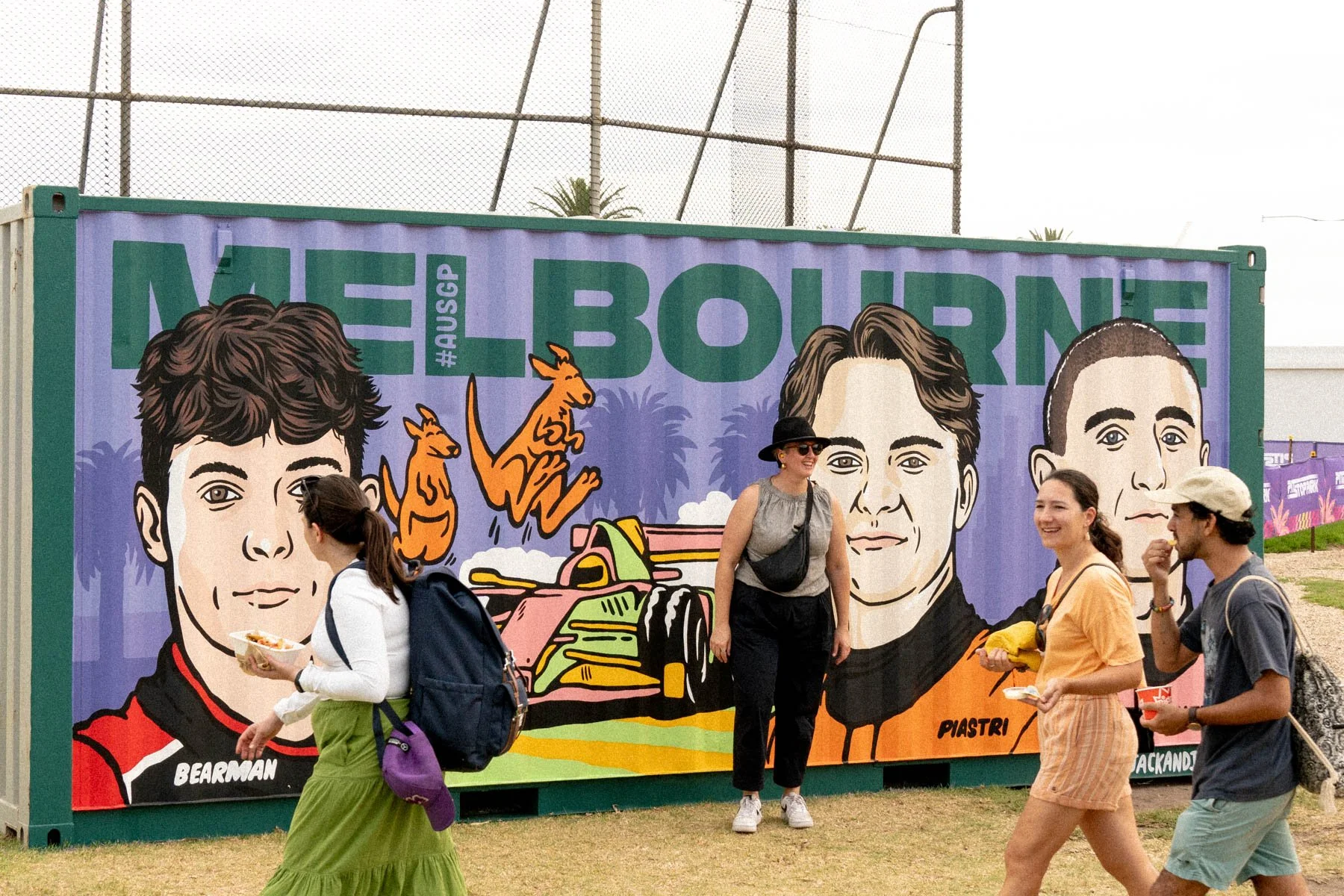 Live paint activation in the family zone at the 2025 Formula 1 Australian Grand Prix, Melbourne. Situated next to the ferris wheel and food trucks, we spent three days painting a shipping container with portraits of Ollie Bearman, Oscar Piastri and Jack Doohan. We spent time chatting with the patrons, who watched and photographed the entire painting process throughout the event.